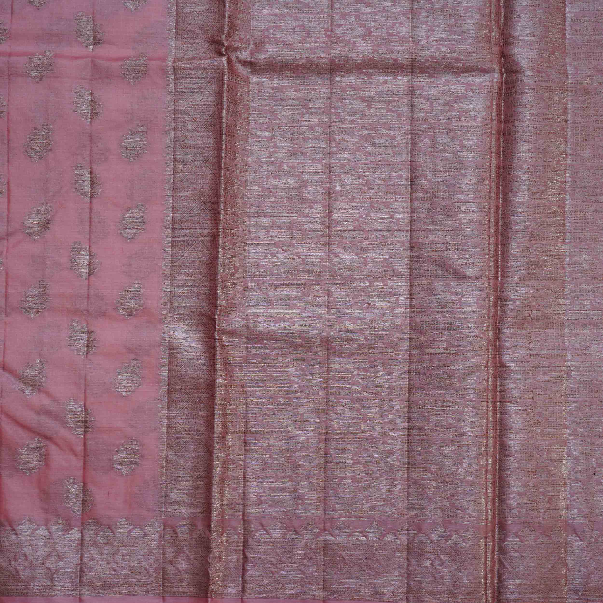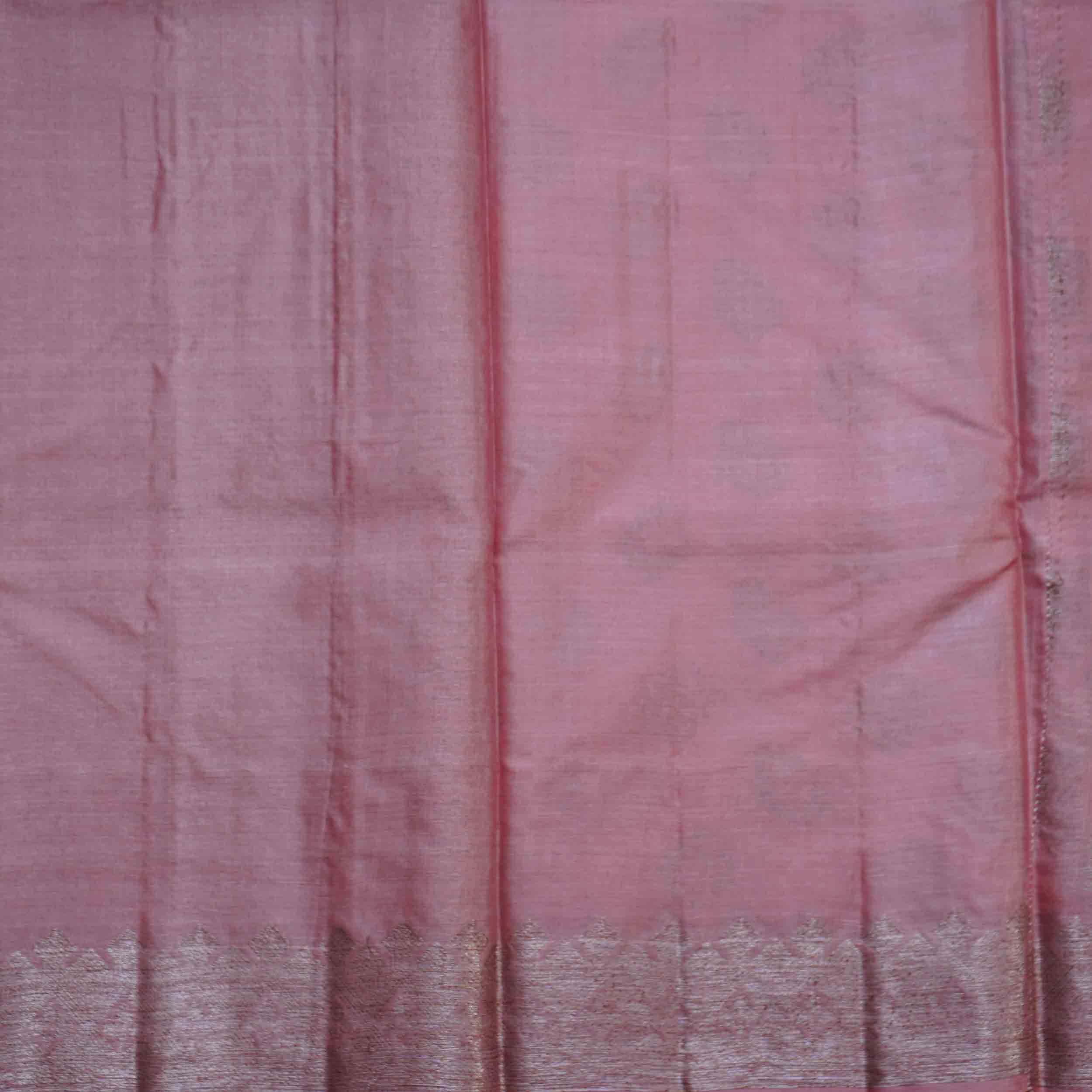 Barbie pink Tussar silk saree with delicate floral zari work. Ideal for daytime weddings or summer festivities. Shop lightweight elegance!