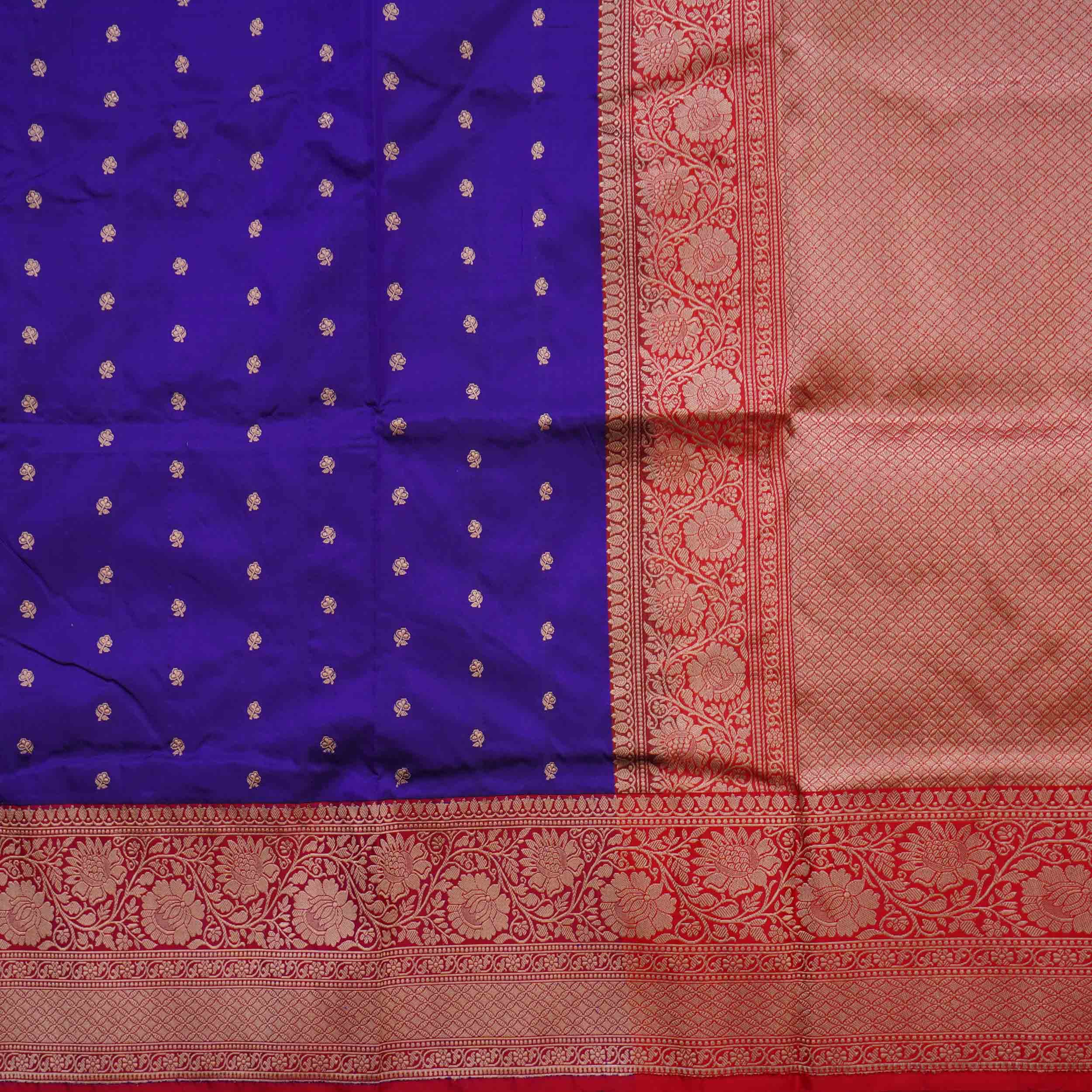 Cadbury Purple Banaras Pattu Saree Highlighted with Golden Zari Floral Design and a contrasting Brick Red Pallu