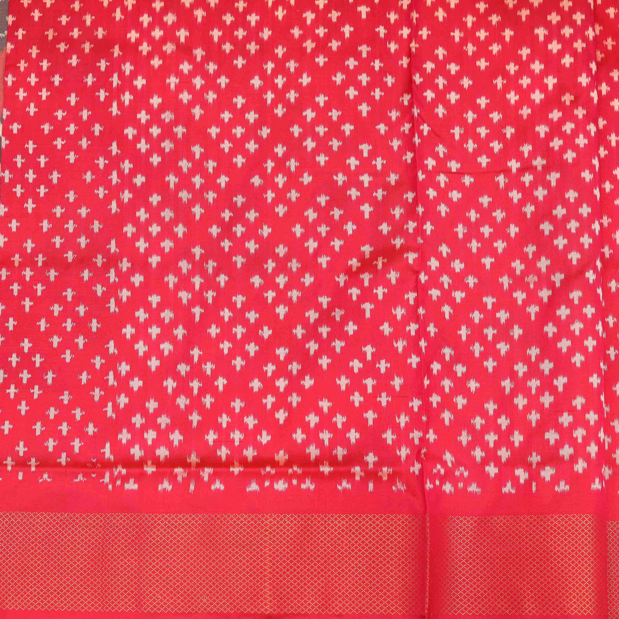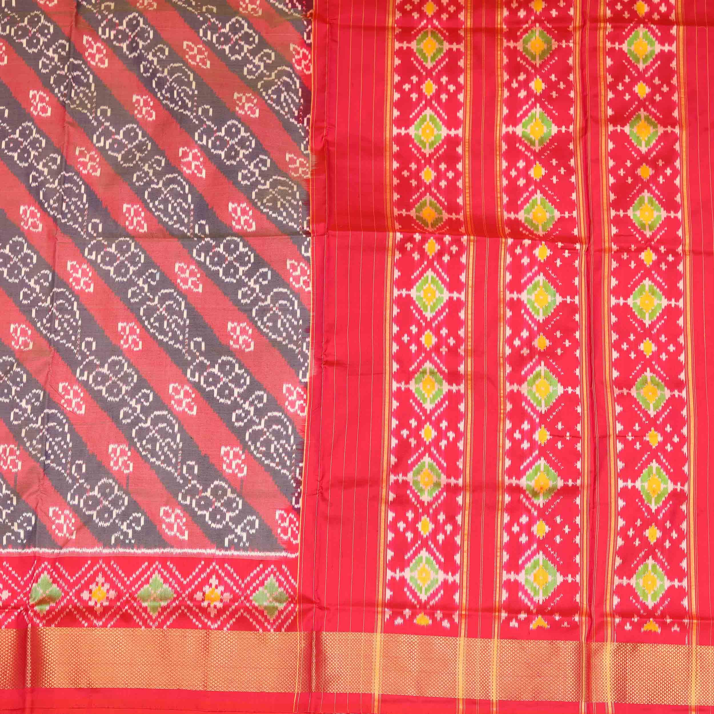 Discover premium Pochampally handloom in vivid candy apple red and muted gray, adorned with precise ikat patterns and a glossy silk finish for standout elegance.