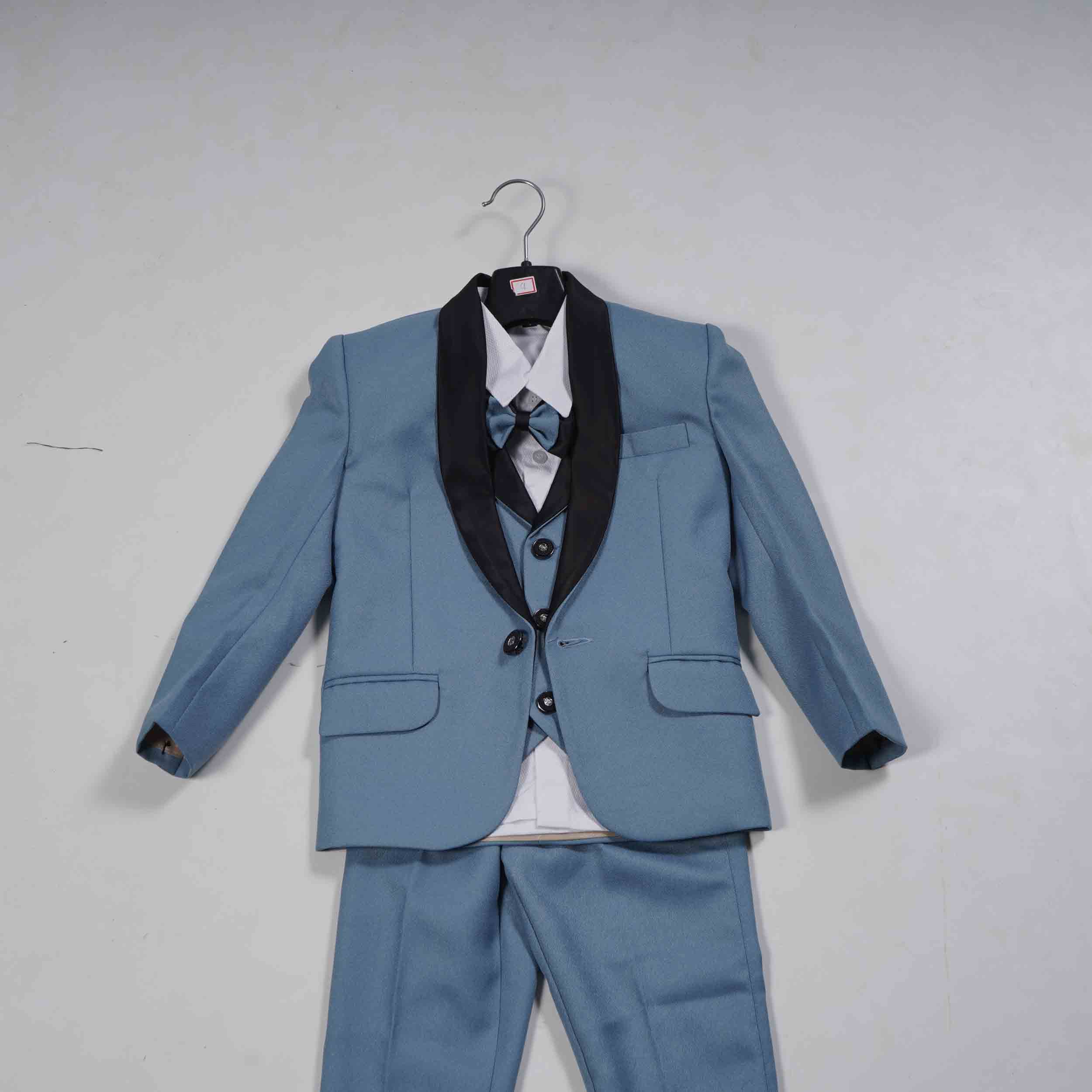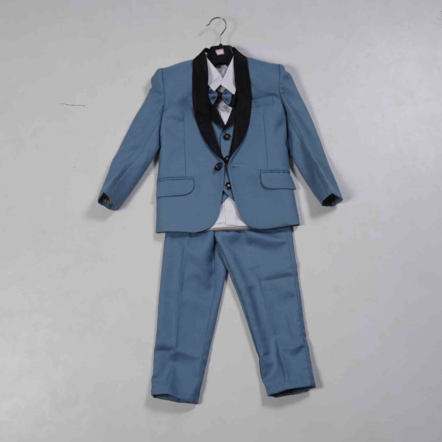 Deep Sky Blue & White 5-Piece Kids Full Coat Party Wear Suit. A complete, stylish, and eye-catching formal outfit for boys. Perfect for celebrations and special occasions. Shop this elegant set today!
