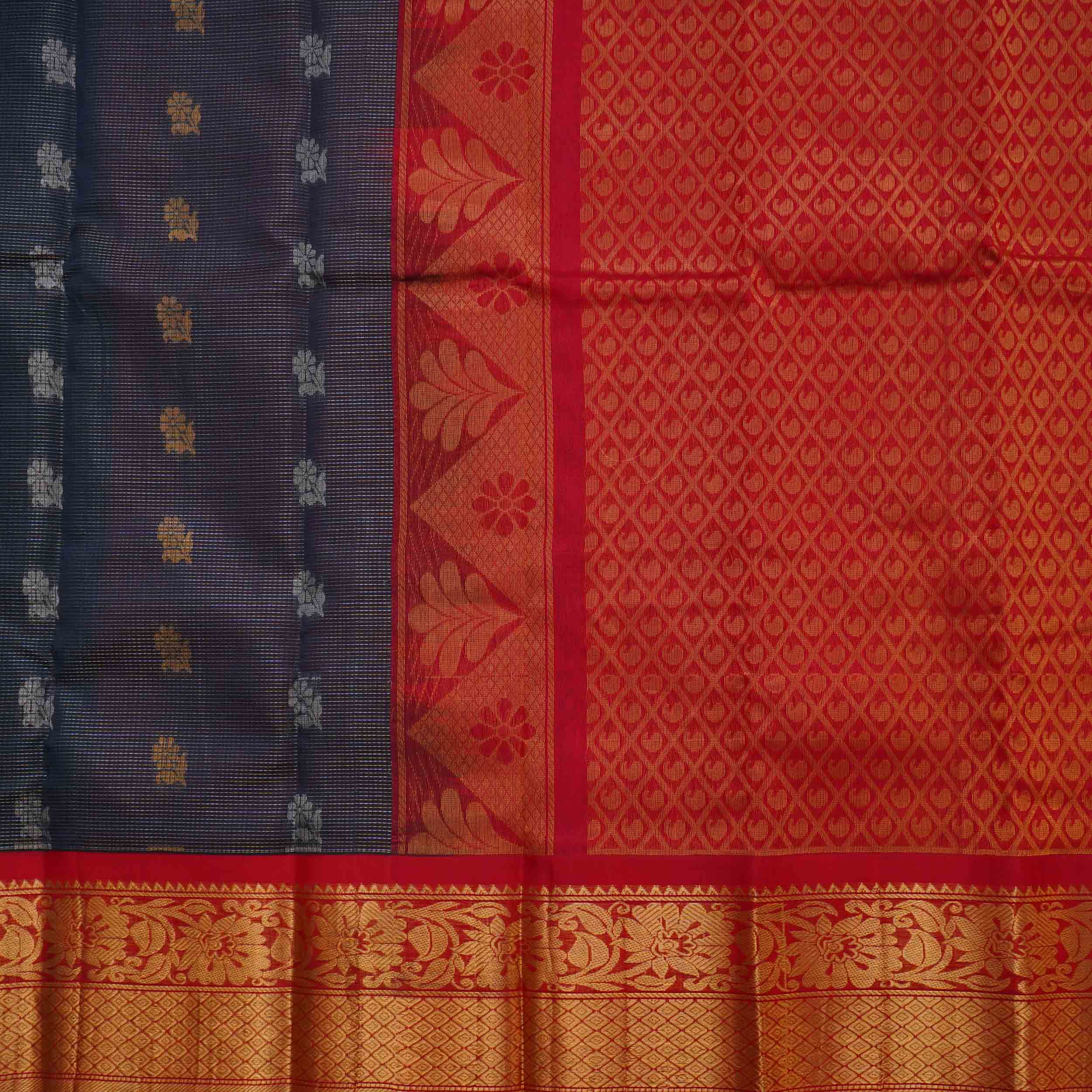 Striking Gun Metal Grey Kuppadam Pattu Saree with Cherry Red Golden Zari Pallu & Long Border. A bold and traditional choice for memorable events. Discover this unique combination today!