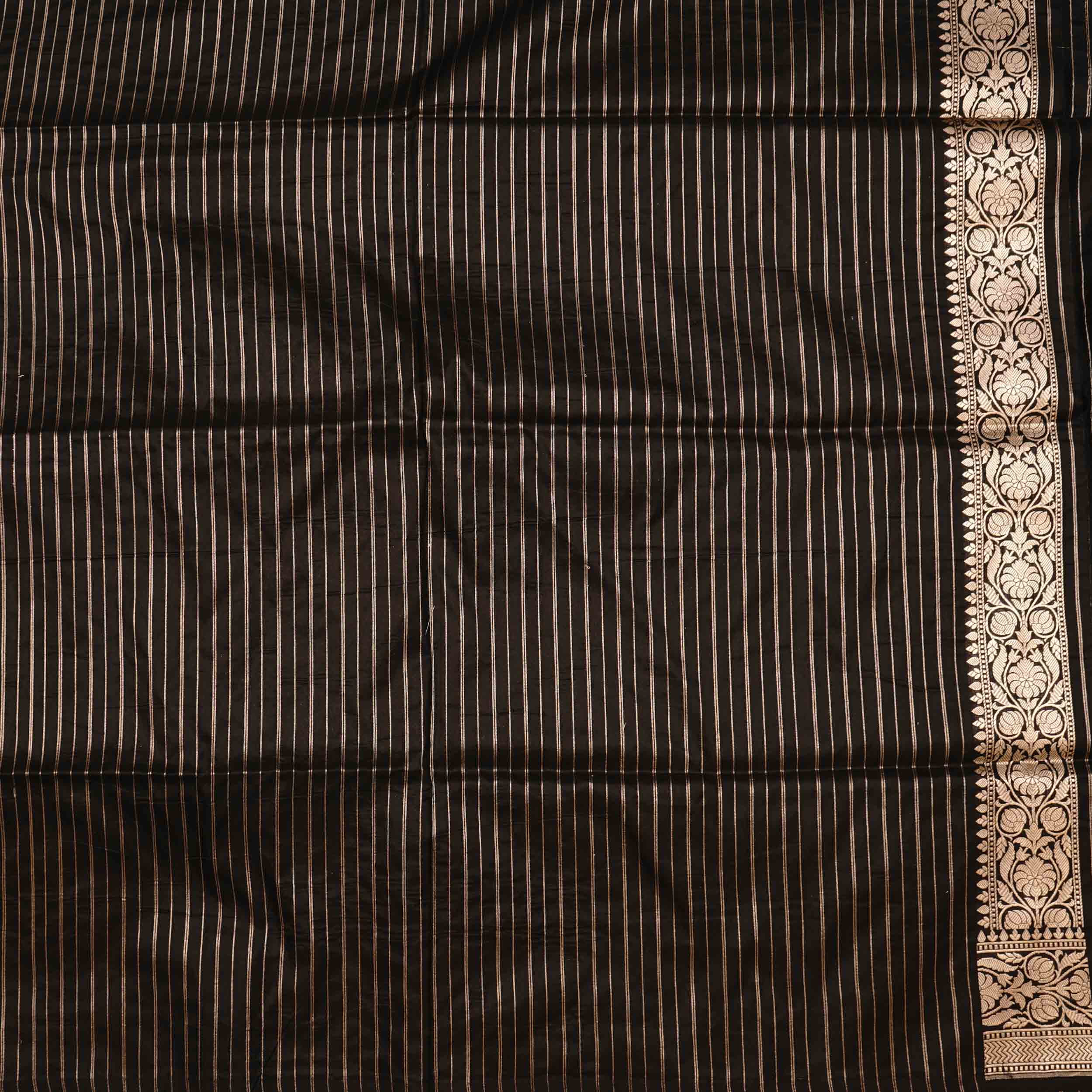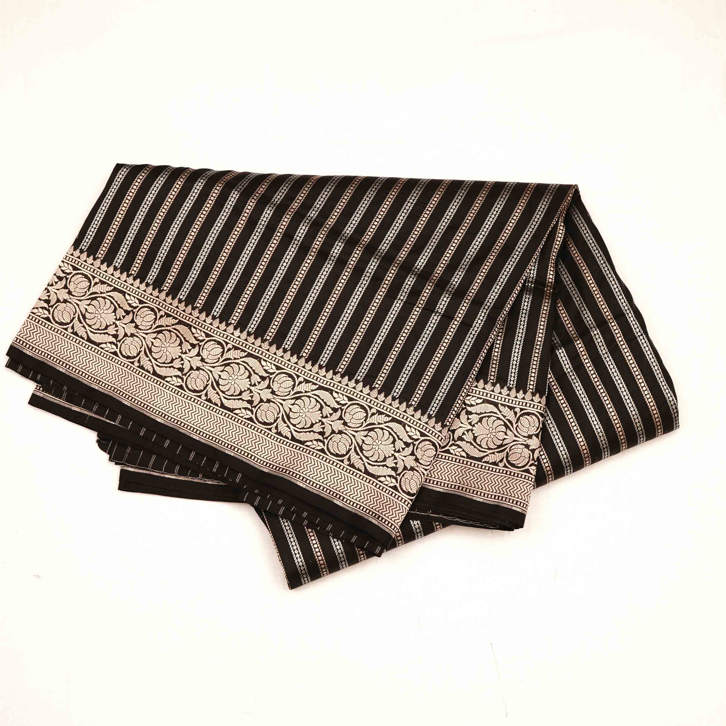 Command attention in this jet black Banaras pattu saree woven with lustrous silk and intricate golden zari motifs. Perfect for evening soirees and festive galas.