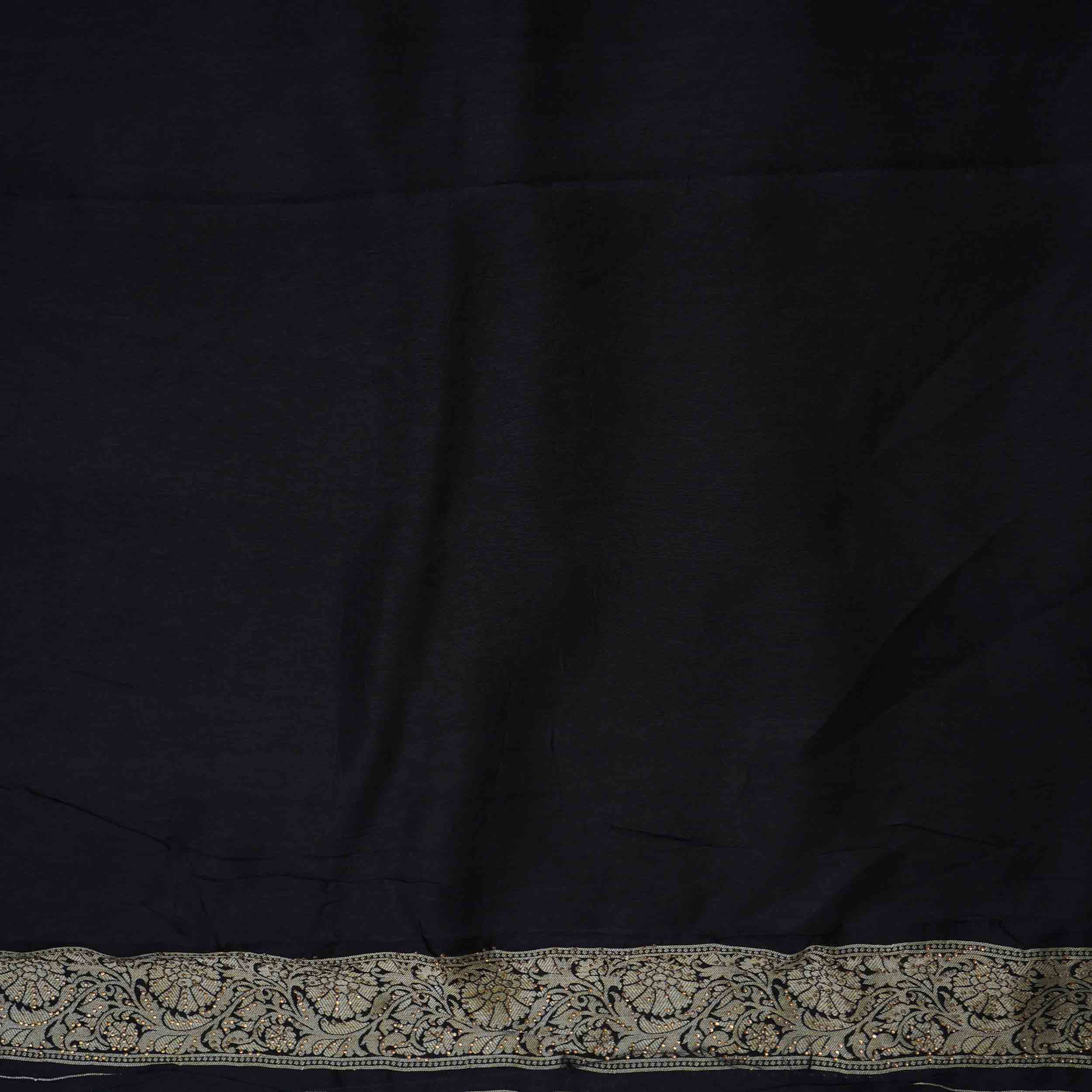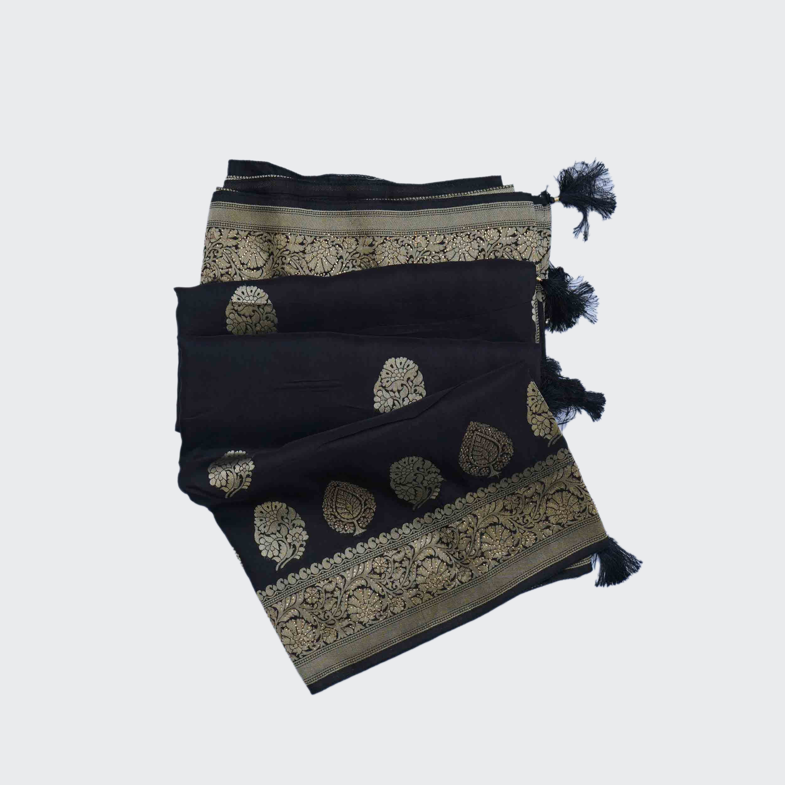 Striking Jet Black Banarasi Fancy Saree with exquisite Golden Zari Work. A captivating choice for special events. Shop now!