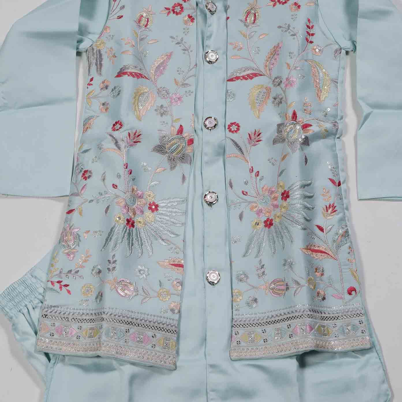 Jordy Blue Floral Print 3-Piece Kids Indo-Western Set. A stylish blend of traditional and modern design. Perfect for festive occasions and cultural events. Shop this unique look today!