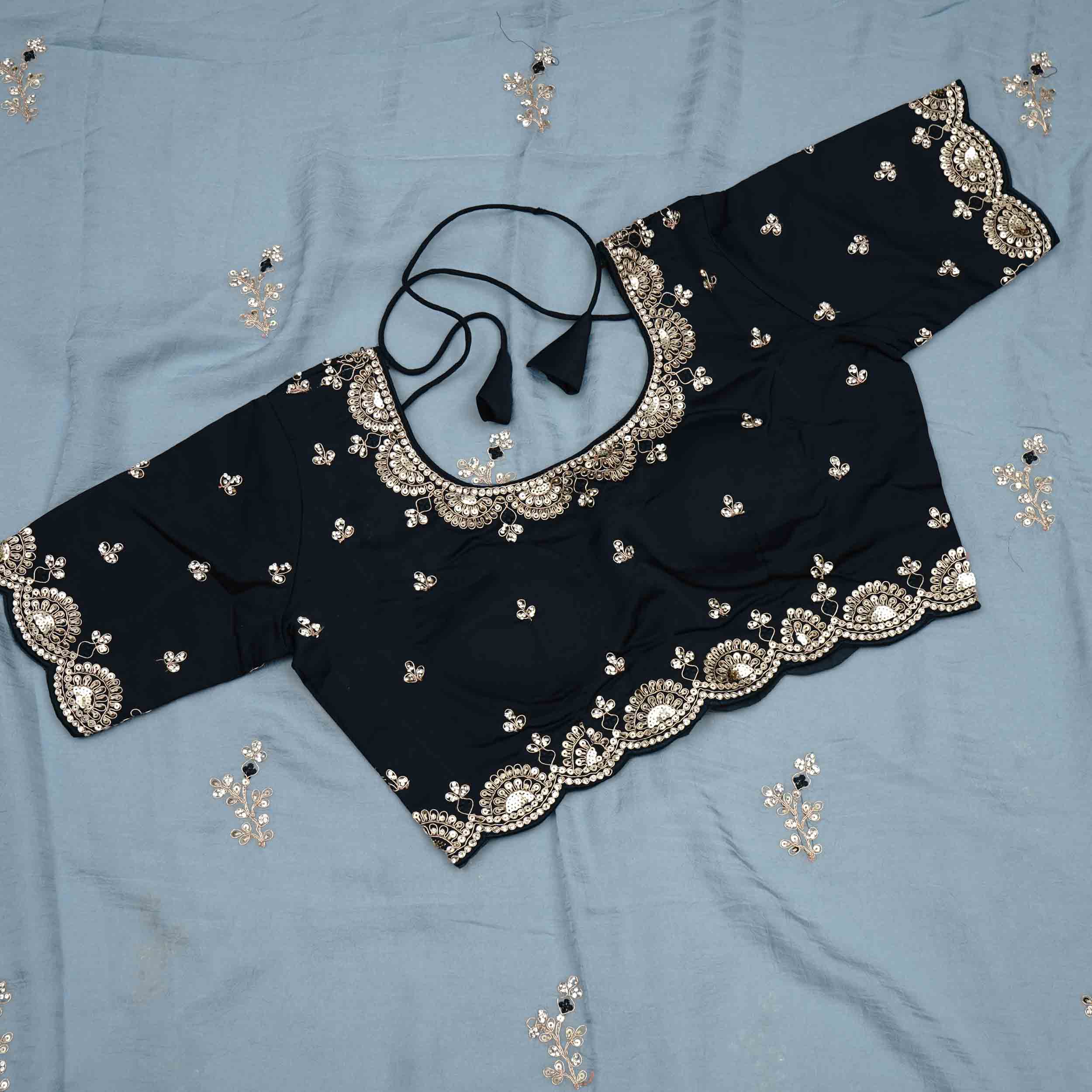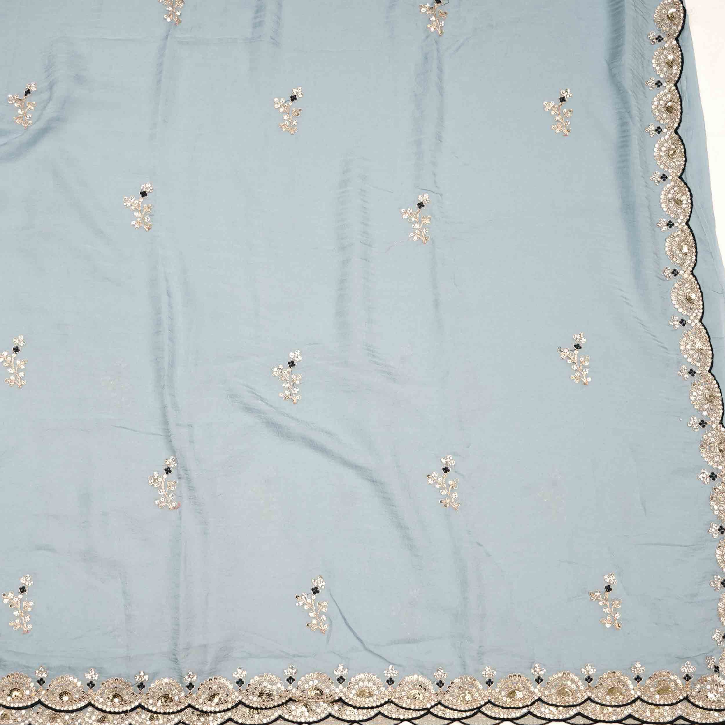 Float through festivities in soothing light blue. This designer saree’s handcrafted motifs and shimmering details evoke serenity and grace for your special moments.