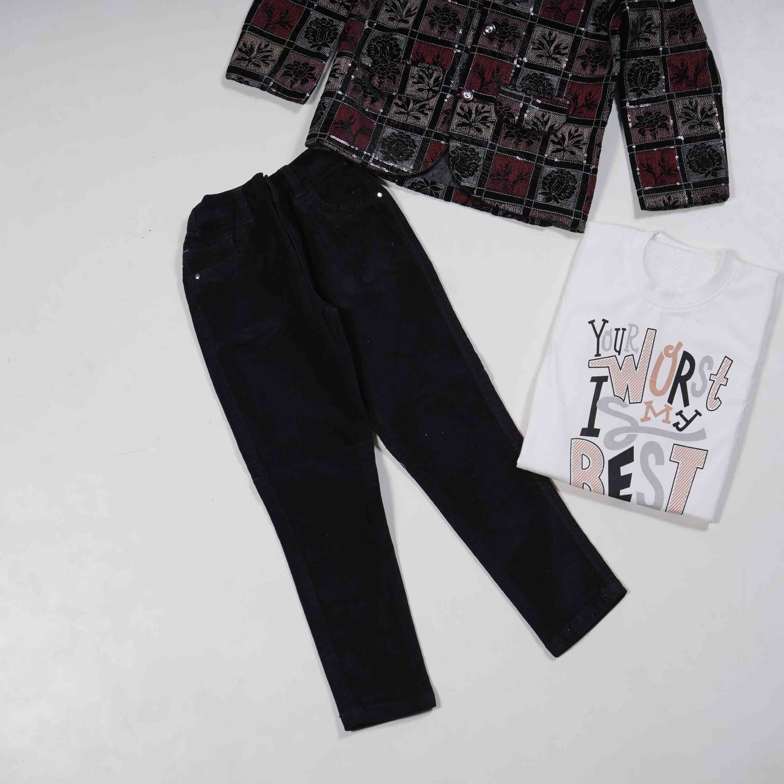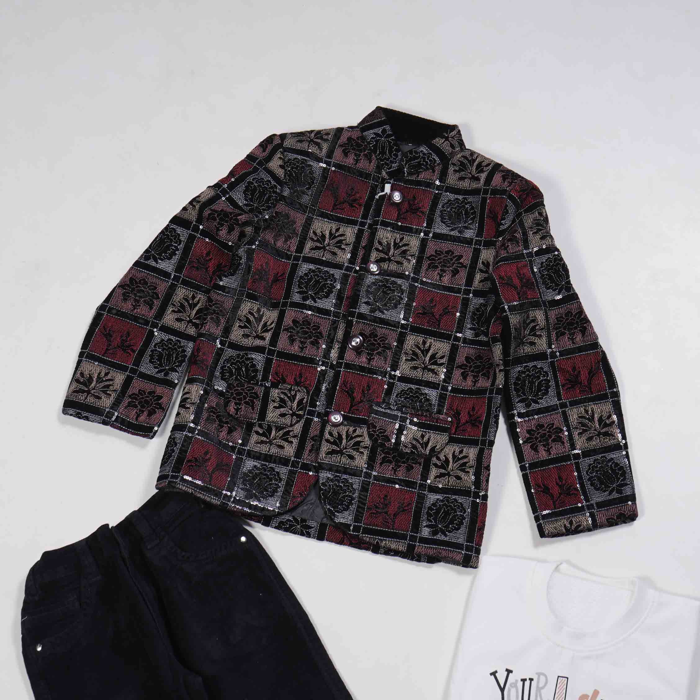 Black shaded Multicolor Jodhpuri Model 3 Piece Kids Suit. A stylish blend of traditional and western design. Perfect for festive occasions and special events. Shop this unique set today!
