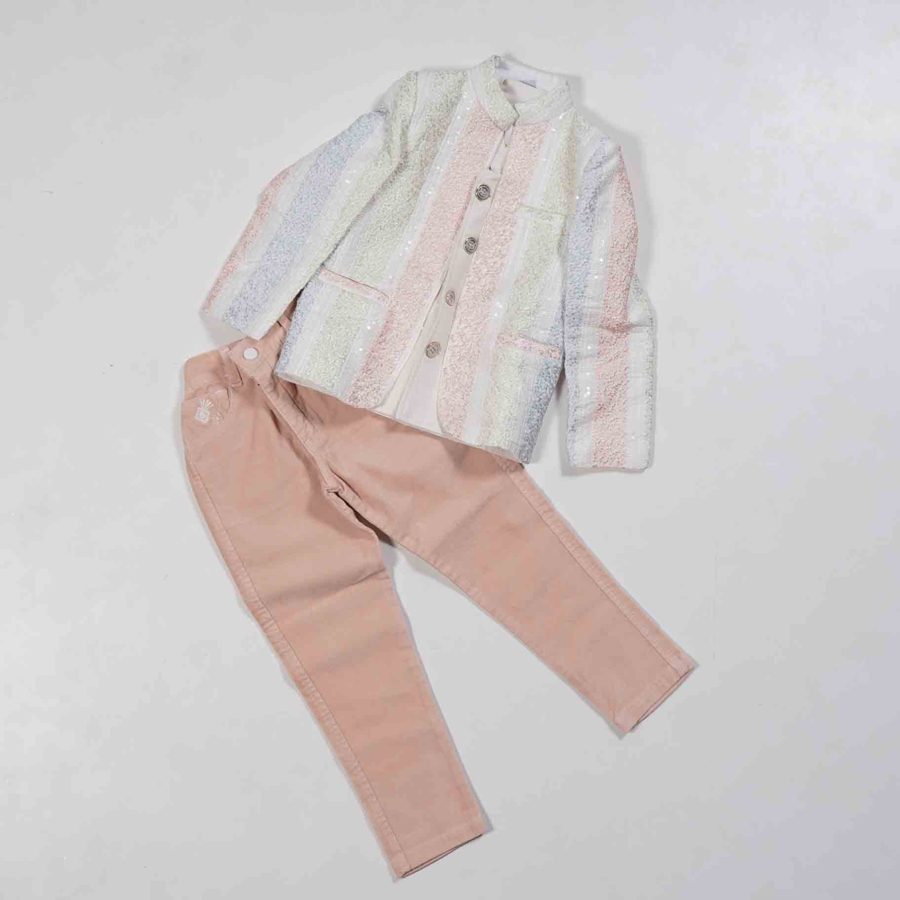 Multicolor Jodhpuri Kids Set with Light Baby Pink Western Top. A unique 3-piece blend of ethnic and western styles. Perfect for festive events. Discover this playful outfit today!