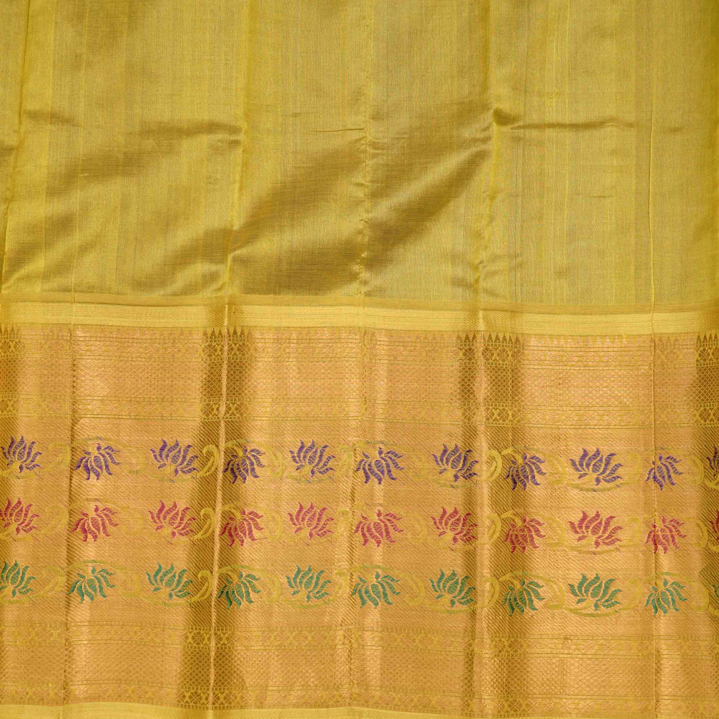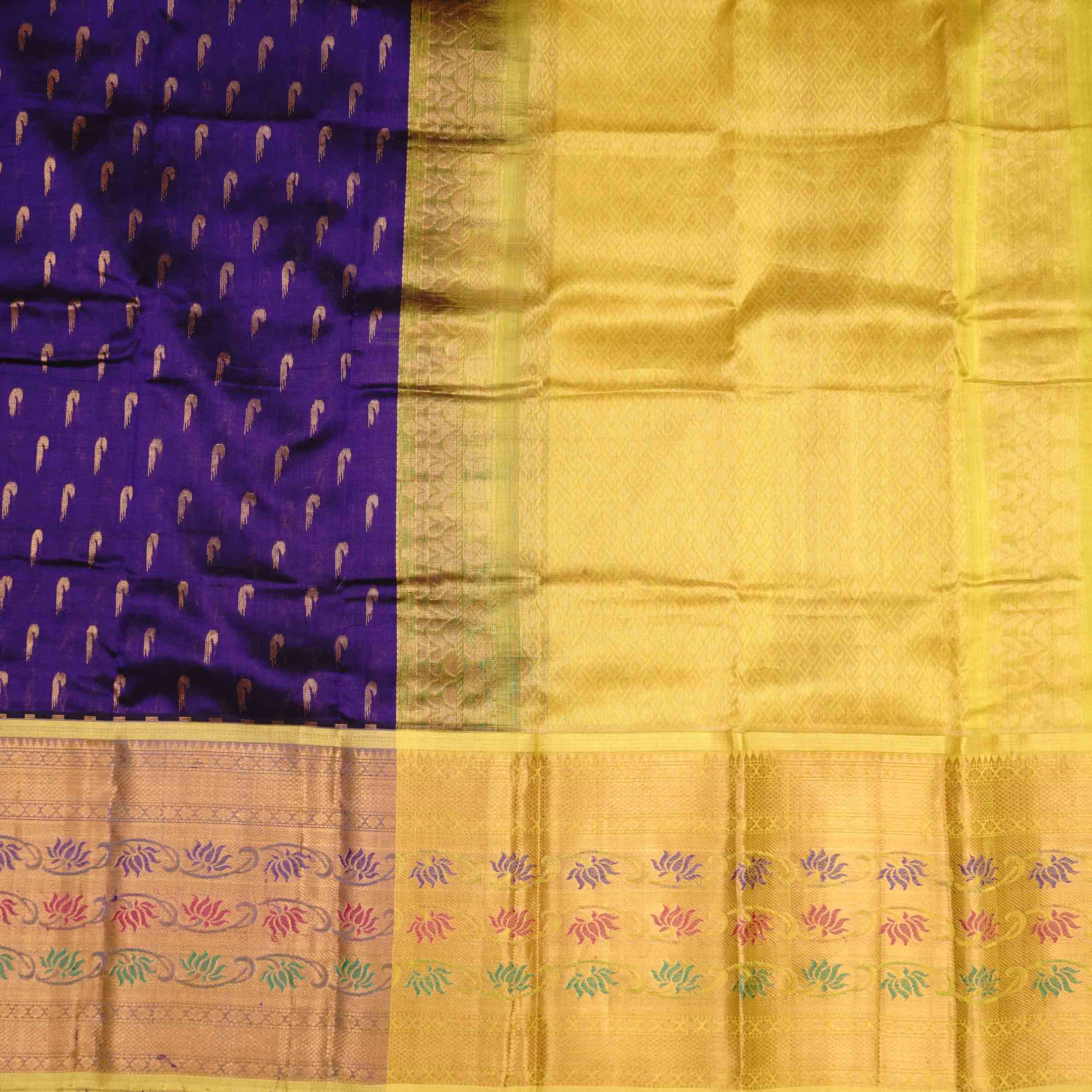 Embrace the lively hue of parrot green silk. This Kuppadam pattu saree’s intricate weave and radiant color bring joy and elegance to every celebration.