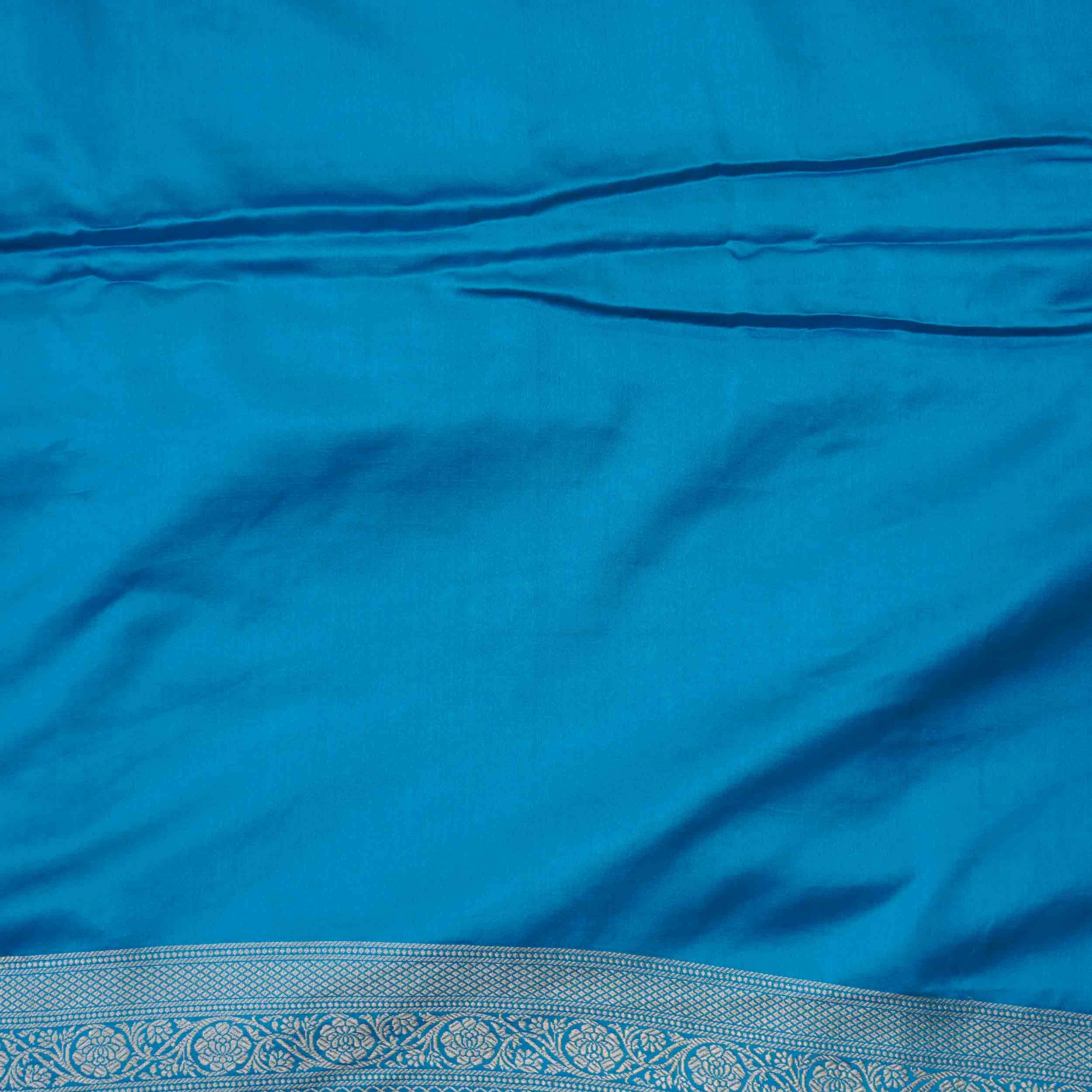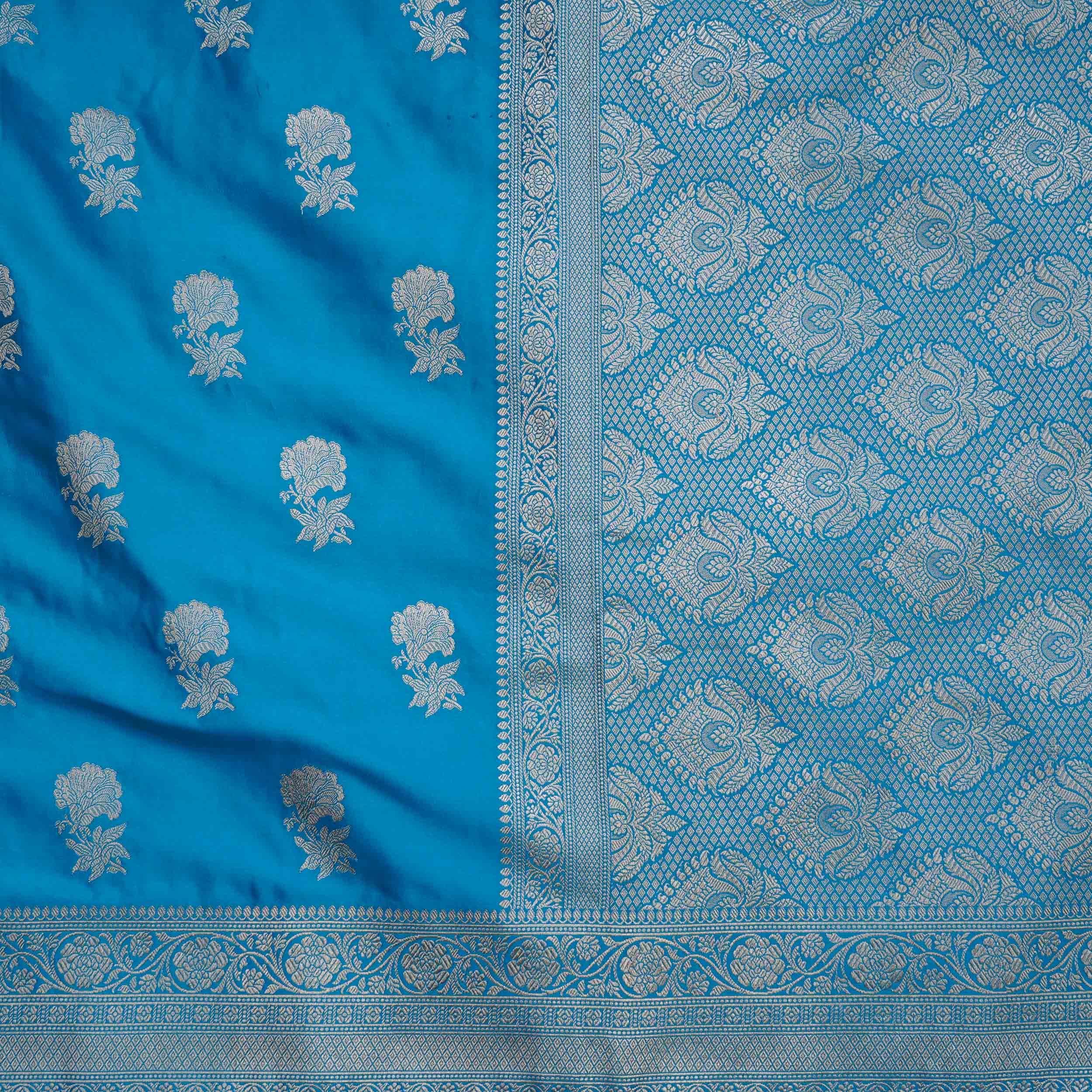 Rich Peacock Blue Banarasi Fancy Saree with shimmering Silver Zari work. A captivating choice for festive events. Shop now!