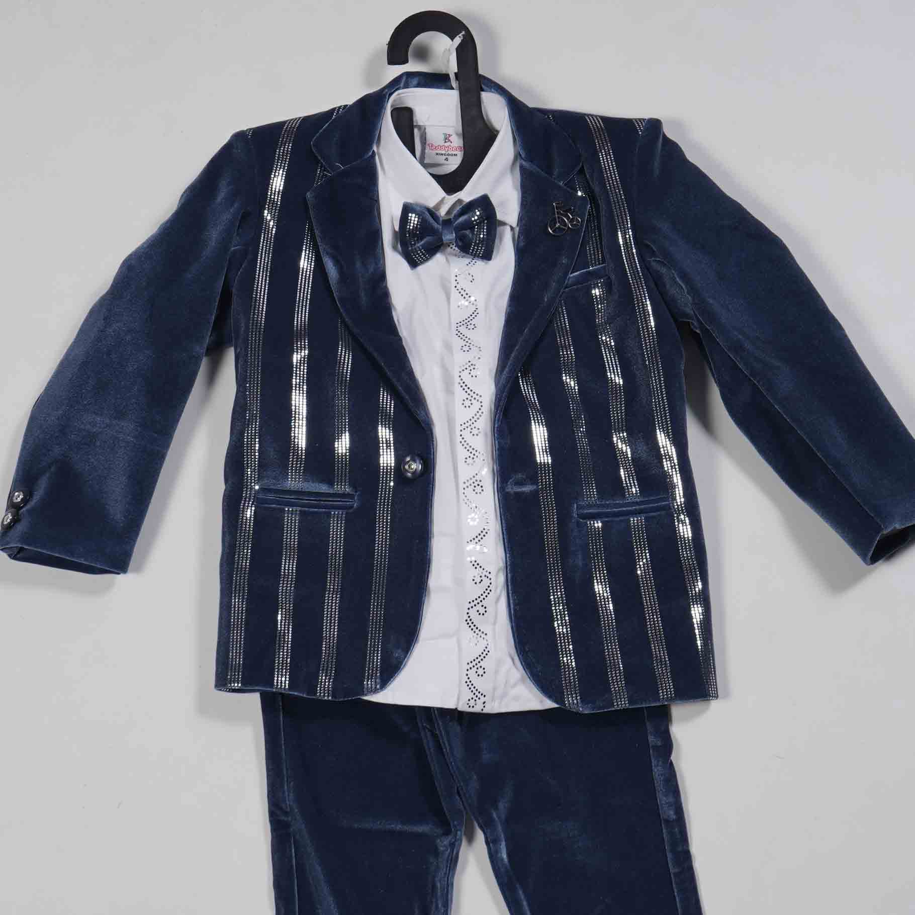 Polynesian Blue 3-Piece Kids Full Coat Set. A sharp and sophisticated party wear option for boys. Perfect for formal events and celebrations. Shop this stylish set today!