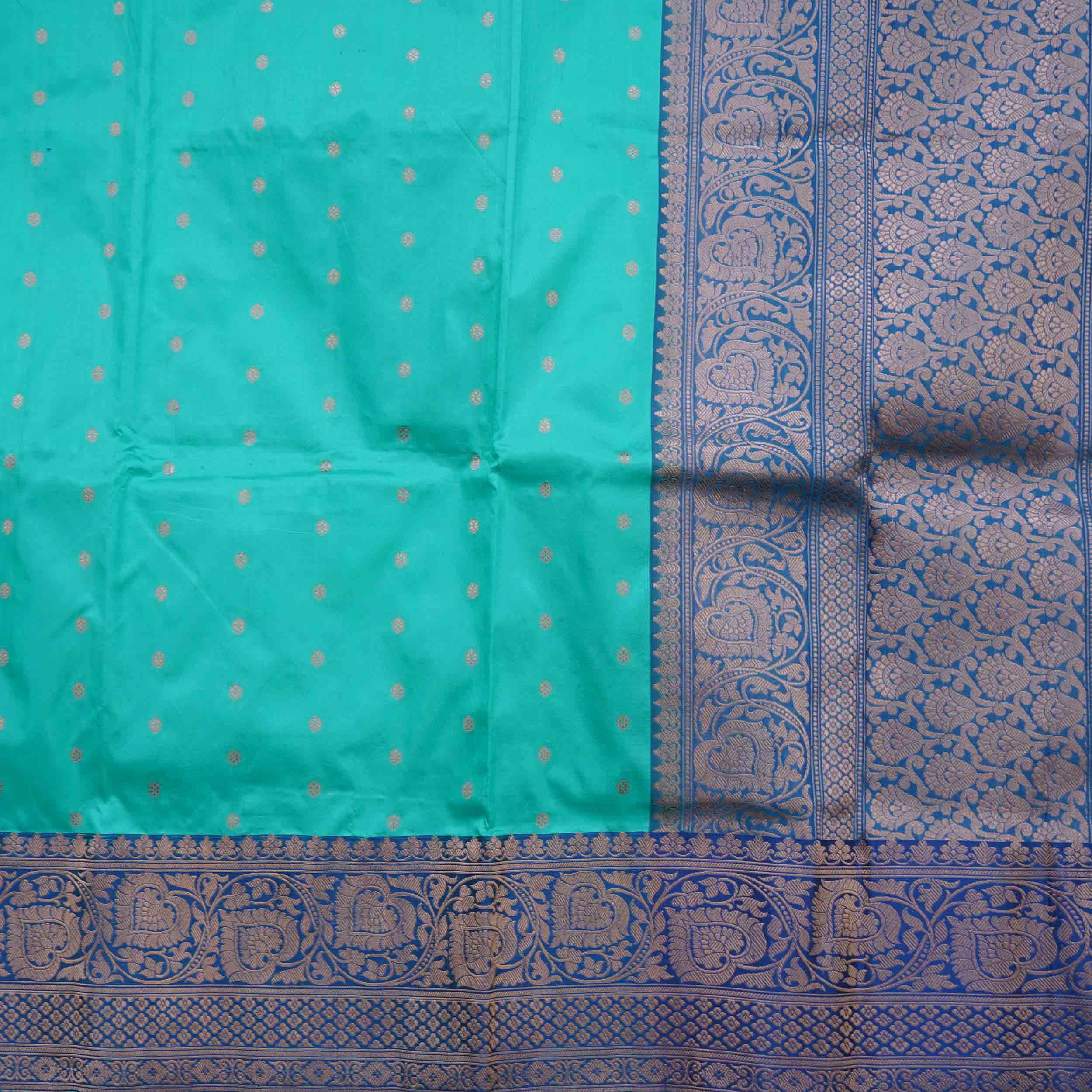 Light Sky Blue Banarasi Pattu Saree with a bold Resolution Blue Pallu. A beautiful contrast for special occasions. Shop now!