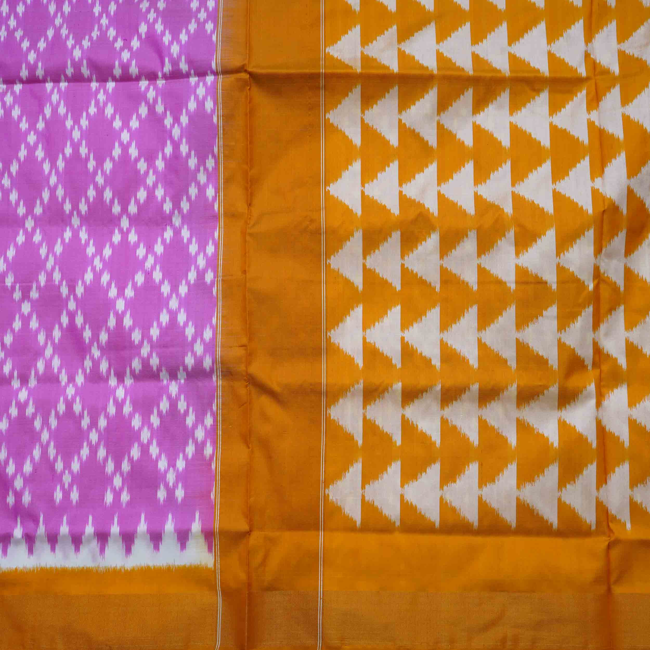 Pochampally silk saree in turmeric yellow and baby pink with ikat patterns and silver zari borders. Ideal for cultural ceremonies. Shop now!